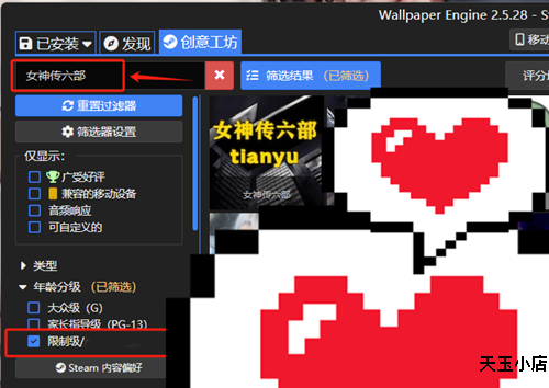 游戏视频可以wallpaper搜索:女神传六部 (需开启红框内选项)